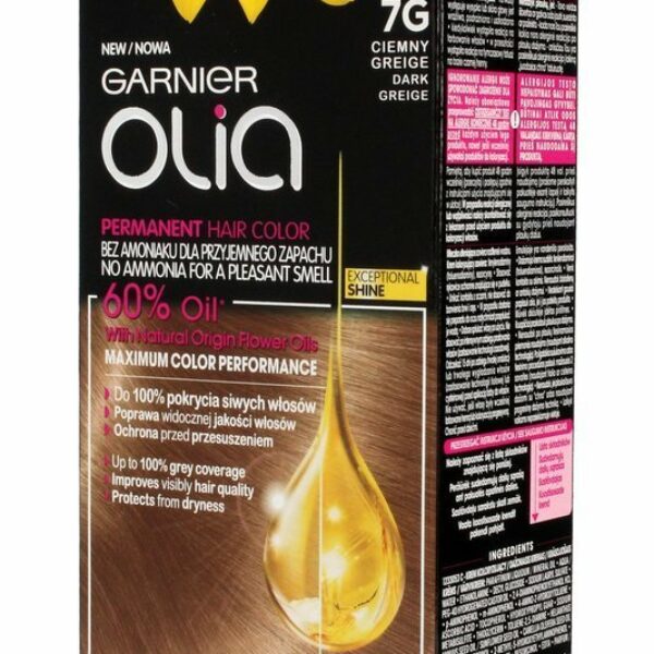 Garnier Olia Farba do Włosów 7G Ciemny GreigeFarba do włosów z serii Olia marki Garnier. Pokrywa w 100% wszystkie włosy, a dodatkowo - wpływa na ich kondycję. W swoim składzie zawiera pielęgnacyjne olejki, które nie przesuszają włosów. Skoncentrowana formuła zapewnia trwały, równomierny i intensywny efekt. Włosy stają się gładkie i miękkie w dotyku. Farba posiada delikatnie kwiatowy zapach. Dostępna w wielu wersjach kolorystycznych. Odcień: 7G Ciemny Greige