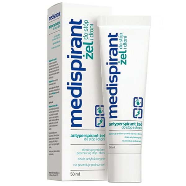 Medispirant Antyperspirant Żel do Stóp i Dłoni 50mlAntyperspirant - żel do stóp i dłoni został stworzony w celu niwelowania problemu pocenia się stóp oraz rąk. Działa antybakteryjnie, niweluje przykry zapach. Kontroluje ilość wydzielanego potu. Tworzy niewidzialną barierę. Posiada lekką, przyjemną konsystencję, która bardzo szybko wtapia się w skórę. Pojemność: 50mlSposób użycia: w pierwszej fazie kuracji - produkt należy aplikować na noc (przez około 2-5 dni), w późniejszym czasie - raz w tygodniu.