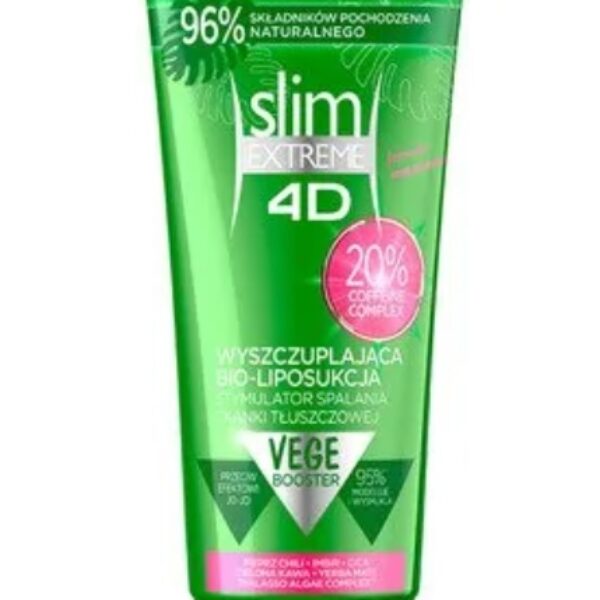 Eveline Slim Extreme 4D Wyszczuplająca Bio-Liposukcja 250mlBioaktywny stymulator spalania tkanki tłuszczowej marki Eveline. Kosmetyk modeluje i wysmukla ciało, zapobiega powstawaniu efektu jojo. Doskonale uzupełnia codzienne treningi. Kosmetyk w swoim składzie zawiera pieprz chili, imbir, zieloną kawę, yerba matę. Posiada rozgrzewającą formułę. Jest alternatywą do zabiegów medycyny estetycznej i bezinwazyjnym sposobem korekcji sylwetki. Pojemność: 250ml
