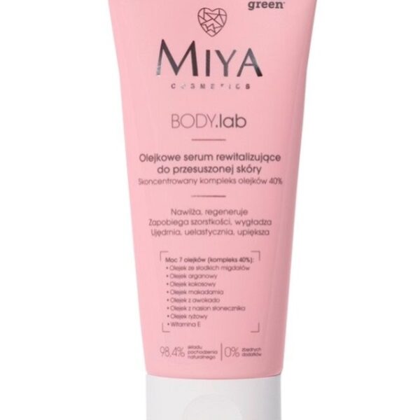 MIYA BODY.lab Olejkowe Serum do Przesuszonej Skóry 200mlOlejkowe serum rewitalizujące do przesuszonej skóry. Stanowi kompleks olejków, które nawilżają, regenerują, wygładzają i ujędrniają skórę. W swoim składzie zawiera olejek ze słodkich migdałów, olejek arganowy, kokosowy, makadamia, olejek z awokado, olejek z nasion słonecznika, witaminę E. Serum chroni mikrobiom skóry, uelastycznia, zmniejsza widoczność przebarwień. 98,4% składników pochodzenia naturalnego. Pojemność: 200ml