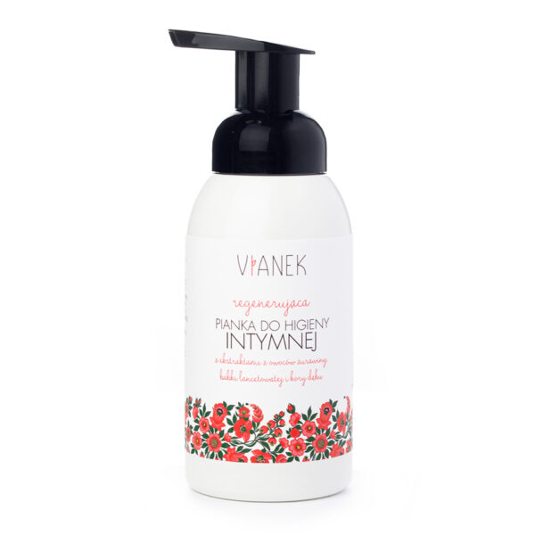 Vianek Regenerująca Pianka do Higieny Intymnej 300mlDelikatna pianka do higieny intymnej, która sprawdzi się podczas codziennej pielęgnacji. W swoim składzie zawiera ekstrakt z babki lancetowatej, kory dębu, owoców żurawiny. Oczyszcza w sposób delikatny, nie powoduje podrażnień, działa regenerująco i nawilżająco. Pozwala na utrzymanie równowagi naturalnej mikroflory bakteryjnej. Pozostawia uczucie świeżości i komfortu. Pojemność: 300ml