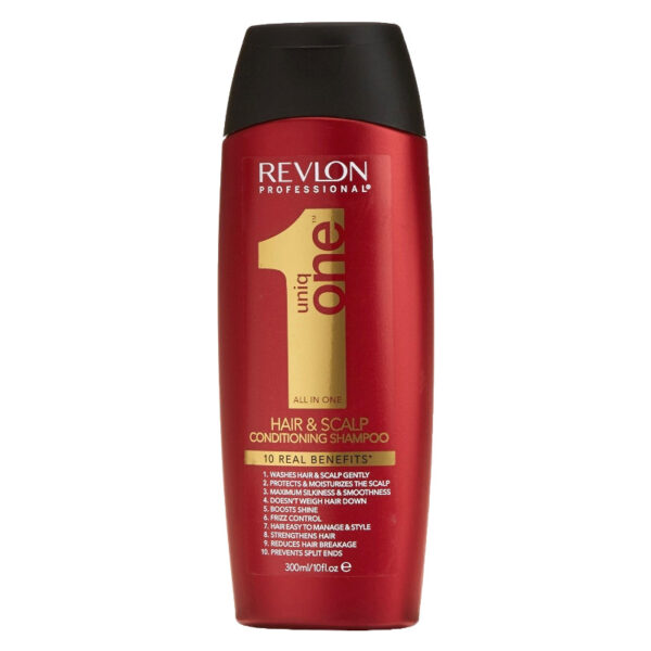 Revlon Uniq One 10w1 Szampon do Włosów 300mlSzampon do włosów o działaniu rewitalizującym i odżywczym.Doskonale sprawdzi się w przypadku pielęgnacji każdego rodzaju włosów. Kosmetyk posiada przyjemną, lekką konsystencję. Zapobiega rozdwajaniu się końcówek, łamliwości. Chroni przed działaniem wysokiej temperatury.Może być stosowany w salonach fryzjerskich. Pojemność: 300ml