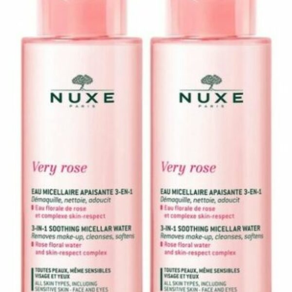 NUXE Very Rose Łagodząca Woda Micelarna 3w1 2x400mlŁagodząca woda micelarna przeznaczony do demakijażu twarzy i okolic oczu.Produkt usuwa zanieczyszczenia, nadmiar sebum i pozostałości makijażu. Idealnie sprawdzi się w przypadku posiadania każdego rodzaju cery, w szczególności - wrażliwej, mieszanej i tłustej. 97% składników pochodzenia naturalnego. ZestawPojemność: 2x400mlSeria: Very Rose