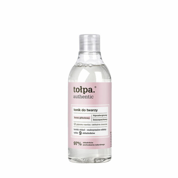 Tołpa Authentic Tonik do Twarzy Kwas Glikolowy 200mlHipoalergiczny i bezzapachowy tonik do twarzy. W swoim składzie zawiera kwas glikolowy.Kosmetyk dogłębnie nawilża skórę i wykazuje działanie delikatnie złuszczające. Linia Authentic charakteryzuje się krótkim składem i maksymalnymi efektami na skórze. 97% składników pochodzenia naturalnego.Tonik przygotowuje skórę na przyjęcie kolejnych kroków pielęgnacyjnych. Pojemność: 200ml