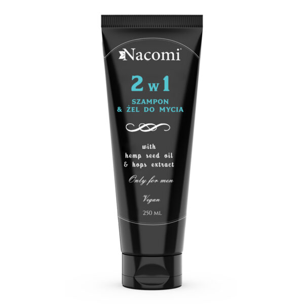 Nacomi Men Szampon & Żel do Mycia dla Mężczyzn 2w1 250mlSzampon + żel do mycia ciała dedykowany dla mężczyzn. Stworzony na bazie naturalnych składników. Doskonale oczyszcza, pielęgnuje i odświeża ciało i włosy. W swoim składzie zawiera olej konopny, ekstrakt z chmielu, który przeciwdziała wypadaniu włosów. Produkt do codziennego stosowania. Pojemność: 250ml