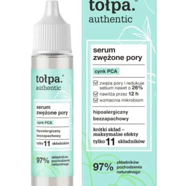Tołpa Authentic Serum Zwężone Pory 20mlSerum do twarzy pochodzący z serii Authentic. Kosmetyk ogranicza ilość wydzielanego sebum, ogranicza błyszczenie się skóry.Przyczynia się do zwężenia widoczności rozszerzonych porów.Wzmacnia mikrobiom skóry, a jednocześnie nawilża skórę. Jest produktem bezzapachowym i hipoalergicznym. 97% składników pochodzenia naturalnego. Pojemność: 20ml