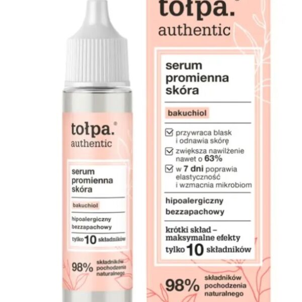 Tołpa Authentic Serum Promienna Skóra 20mlSerum do twarzy pochodzące z serii Authentic. Kosmetyk przywraca cerze zdrowy, promienny blask. Pozostawia skórę nawilżoną, jędrną i elastyczną. Przy systematycznym stosowaniu poprawia teksturę skóry i wzmacnia mikrobiom. Jest produktem bezzapachowym i hipoalergicznym. 98% składników pochodzenia naturalnego. Pojemność: 20ml
