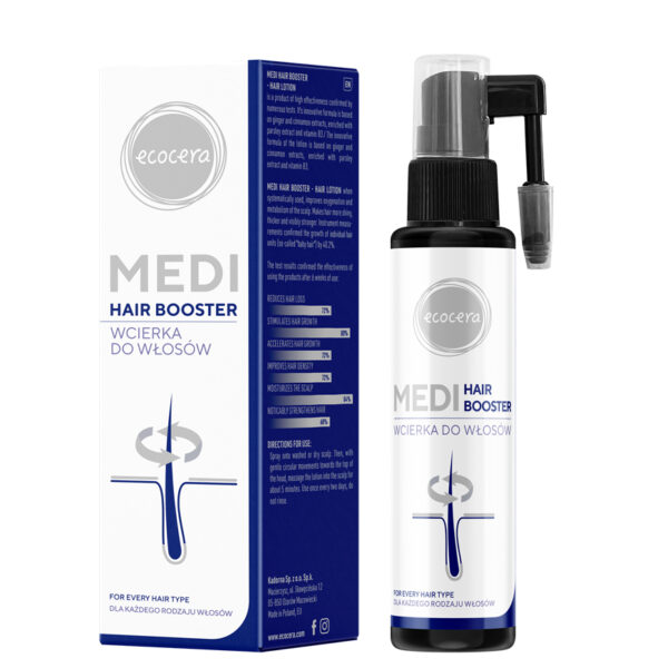 Ecocera Medi Hair Booster Wcierka do Włosów 75mlWcierka przeznaczona do każdego rodzaju włosów. Kosmetyk ogranicza wypadanie włosów, stymuluje ich wzrost, przyspiesza porost. Doskonale poprawia ich gęstość a przy tym nawilża skórę głowy. Przy systematycznym stosowaniu włosy stają się lśniące i wyraźnie grubsze. Kosmetyk stworzony na bazie ekstraktu z imbiru, cynamonu, wyciągu z pietruszki oraz witaminy B3. Pojemność: 75ml