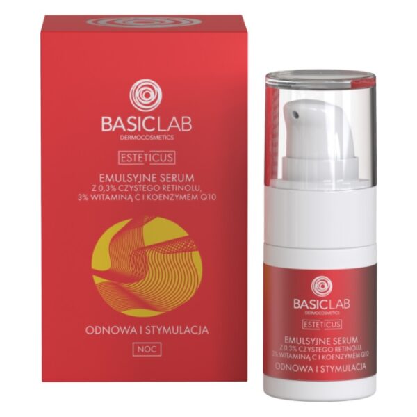 BasicLab Esteticus Emulsyjne Serum z Retinolem 0,3% 15mlSpecjalistyczne serum w postaci emulsji do stosowania podczas wieczornej pielęgnacji. W swoim składzie zawiera czysty retinol, witaminę C, koenzym Q10. Kosmetyk poprawia jędrność skóry, wygładza naskórek, zmniejsza widoczność porów i zmarszczek. Zawartość witaminy C sprawia, że skóra odzyskuje swój blask, a jej koloryt staje się ujednolicony. Produkt spowalnia proces starzenia się skóry, wzmacnia barierę hydrolipidową. Pojemność: 15ml
