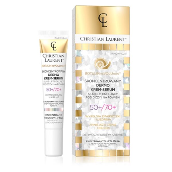 Christian Laurent Krem Liftingujący pod Oczy i na Powieki 50+/70+ 20mlSkoncentrowany dermo krem-serum silnie liftingujący. Może być aplikowany pod oczy i na powieki. Dedykowany jest dla kobiet 50-70+. Doskonale wypełnia zmarszczki, działa napinająco i ujędrniająco na delikatny obszar okolicy oczu. Zmniejsza cienie i obrzęki, wypełnia zmarszczki i ujędrnia. Kosmetyk w swoim składzie zawiera aż 13 peptydów, śluz ślimaka, kofeinę. Pojemność: 20ml