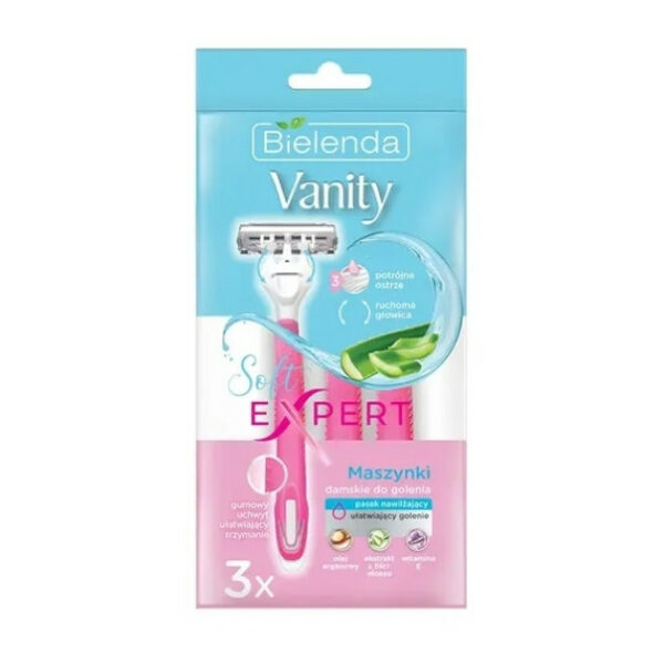 Bielenda Vanity Soft Expert Maszynki 3 SztukiMaszynki damskie do golenia. Posiadają gumowy uchwyt ułatwiający trzymanie maszynki i większą kontrolę. Zawierają potrójne ostrze oraz ruchomą głowicę. Posiadają pasek nawilżający, który ułatwia depilację. Pasek wzbogacony olejem arganowym, ekstraktem z liści aloesu, witaminą E.Pojemność opakowania: 3 sztuki