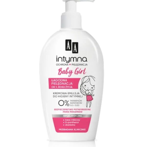 AA Intymna Girls Emulsja do Higieny Intymnej 300mlEmulsja stworzona z myślą o dziewczynkach przed okresem dojrzewania. Może być stosowana od 1. do 12. roku życia. Zapewnia uczucie świeżości, chroni przed infekcjami. Składniki zawarte w emulsji chronią przed infekcjami, łagodzą podrażnienia i koją skórę. Nie zawiera SLS, SLES, barwników, substancji zapachowych, mydła. Pojemność: 300ml