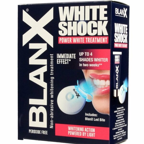 BLANX Intensywny System Wybielający White Shock 50mlIntensywny system wybielający zęby marki BLANX.Produkt należy stosować tak, jak tradycyjną pastę do zębów, a następnie umieścić BlanX Led Bite w ustach i oświetlać zęby przez minutę. Dla uzyskania bardziej olśniewającej bieli należy stosować urządzenie co najmniej raz w tygodniu przez 10 minut. Produkt wybiela zęby, usuwa bakterie, pomaga utrzymać zdrowe dziąsła. Pojemność: 50ml
