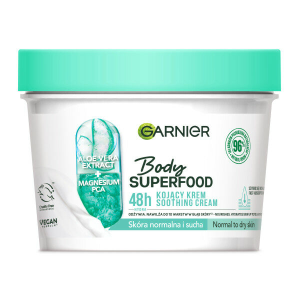 Garnier Body Superfood Kojący Krem Skóra Normalna i Sucha 380mlKojący krem do ciała o działaniu nawilżającym, łagodzącym, odżywczym. Kosmetyk dedykowany jest do skóry normalnej i suchej. Doskonale pielęgnuje skórę, dba o odpowiedni poziom nawodnienia. Pochodzi z wyjątkowej serii produktów Body Superfood. W swojej formule zawiera aż 96% składników pochodzenia naturalnego. Pojemność: 380mlSkóra: Normalna i Sucha