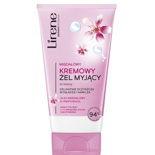 Lirene Kremowy Żel Myjący do Twarzy 150mlŻel przeznaczony do oczyszczania skóry twarzy.Sprawdzi się podczas codziennej pielęgnacji każdego rodzaju skóry, w tym również przy cerze suchej, naczynkowej i wrażliwej.Kosmetyk w swojej formule zawiera olej migdałowy oraz d-panthenol. Długotrwale nawadnia, oczyszcza i wygładza skórę. 94% składników pochodzenia naturalnego. Pojemność: 150ml