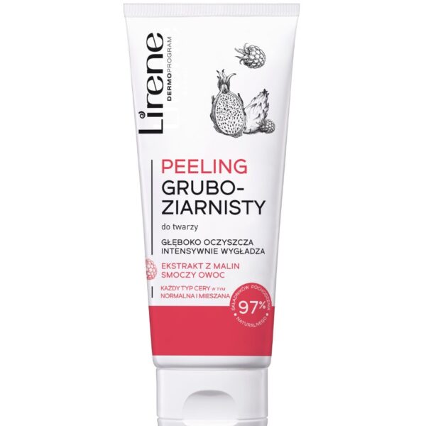 Lirene Peeling Gruboziarnisty do Twarzy 75mlGruboziarnisty peeling do twarzy, który skutecznie oczyszcza, złuszcza, wygładza naskórek.Doskonale uzupełnia codzienną pielęgnację każdego rodzaju skóry.Kosmetyk w swoim składzie zawiera ekstrakt z malin, smoczy owoc. 97% składników pochodzenia naturalnego. Pojemność: 75ml