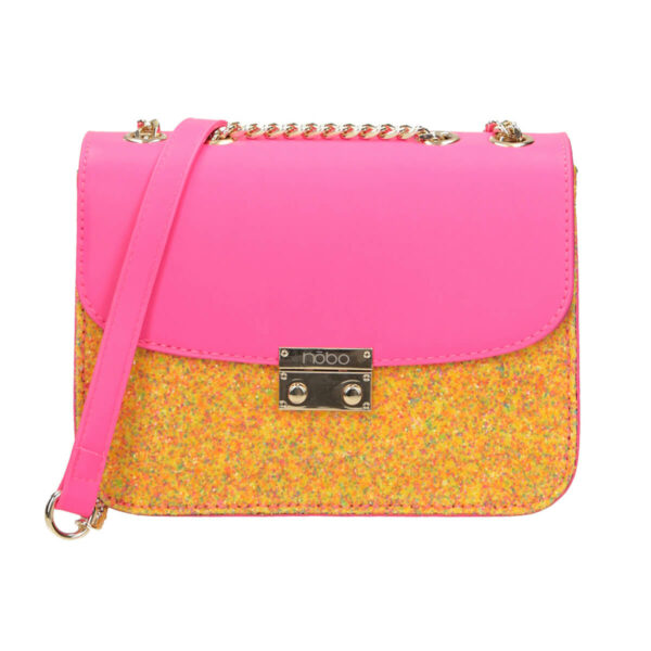 Elegancka, różowa listonoszka Nobo. Ten model wyróżnia się połyskującą, brokatową fakturą która mieni się jak diamenty. Torebka będzie ozdobnym dodatkiem do sukienki czy spodni. Posiada złoty łańcuszek, który pełni rolę paska na ramię. Zamykana na klapkę z zatrzaskiem. W środku znajdują się dwie kieszonki w tym jedna zamykana na suwak.
