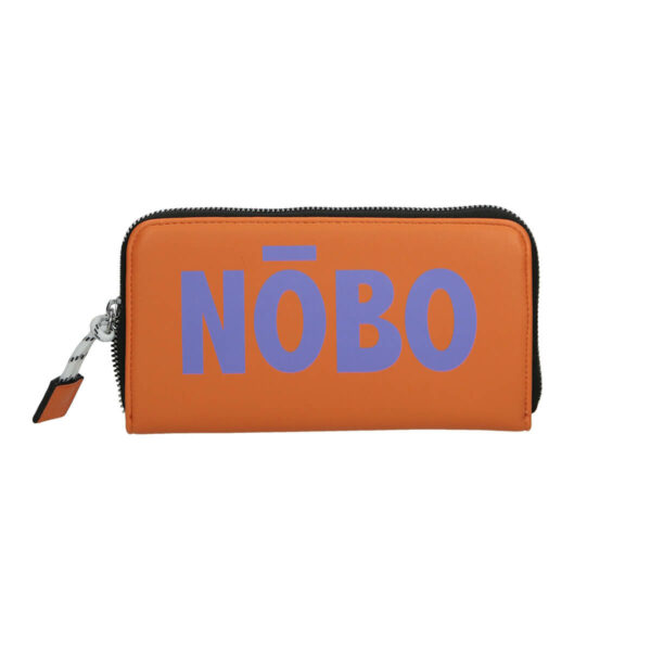 Pojemny i stylowy pomarańczowy portfel Nobo. Jego charakterystyczną cechą jest duże, fioletowe logo firmy z przodu. W środku posiada dwie komory, które przedzielone są zapinaną kieszonką na bilon. Po bokach znajduje się 8 kieszonek na karty i 2 większe na gotówkę. Zamykany na zamek z ozdobnym sznurkiem.