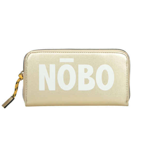 Pojemny i stylowy portfel Nobo. Jego charakterystyczną cechą jest złota, połyskująca faktura i duże logo firmy z przodu. W środku posiada dwie komory, które przedzielone są zapinaną kieszonką na bilon. Po bokach znajduje się 8 kieszonek na karty i 2 większe na gotówkę. Zamykany na zamek z ozdobnym sznurkiem.