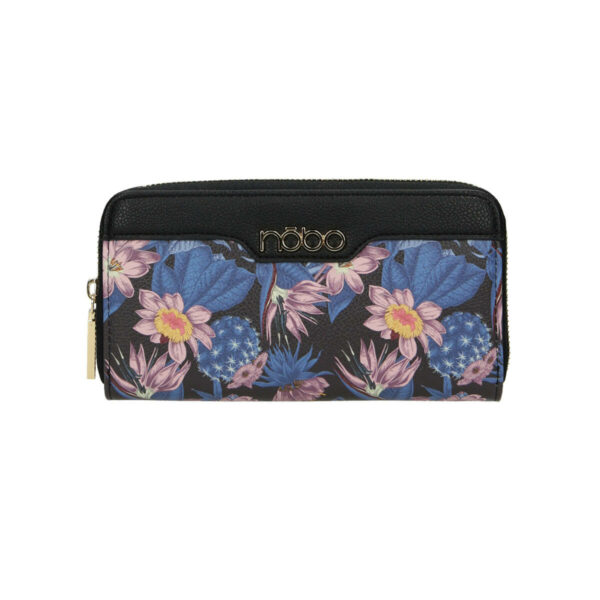 Duży portfel Nobo w multikolorowym ubarwieniu z przewagą czarno-niebieskich odcieni. Posiada piękny nadruk z tropikalnymi i polnymi kwiatami. W środku wykończony beżową podszewką. Znajduje się w nim 8 kieszonek na karty, 2 duże na gotówkę oraz 2 przegrody, które przedzielone są kieszonką na bilon. Portfel otrzymasz zapakowany w eleganckie, czarne pudełko.