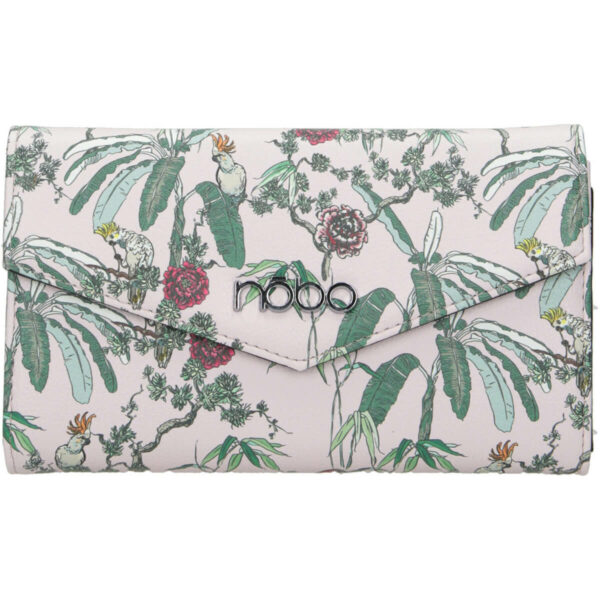 Elegancki, różowy portfel Nobo z multikolorowym, tropikalnym nadrukiem. Ten model pełni również funkcję małej torebki dzięki dopinanemu łańcuszkowi. Idealnie sprawdzi się na imprezę i na wieczorną kolację, kiedy potrzebujesz jedynie miejsca na karty, pieniądze, telefon i szminkę. Portfel zamykany jest na klapkę z magnesem. W środku znajduje się 12 małych kieszonek, dwie duże oraz przedzielająca dwie komory- kieszonka na bilon.