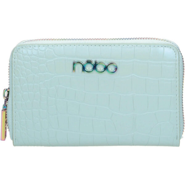 Średniej wielkości niebieski portfel Nobo z fakturą skóry krokodyla. Ten model posiada śliczne, tęczowe okucia. Środek portfela przedzielony jest zamykaną kieszonką na bilon. W środku znajduje się 6 kieszonek na karty.