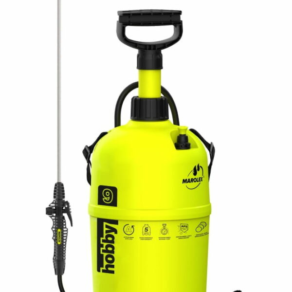 Opryskiwacz ogrodniczy Hobby 9 to uniwersalne urządzenie kompresyjne o pojemności 10 litrów. Większa objętość zbiornika pozwala na nieprzerwaną pracę, zarówno w dużym ogrodzie, sadzie, szklarni lub szkółce roślin, jak i na uprawach polowych oraz na plantacjach, bez potrzeby ciągłego uzupełniania zbiornika. Przeznaczony jest do rozpylania wszelkich środków ochrony roślin i płynnych nawozów. Wszystkie elementy urządzenia zostały wykonane z tworzywa o podwyższonej odporności na działanie środków chemicznych, co gwarantuje długą żywotność i bezawaryjne użytkowanie. Opryskiwacz został wyposażony w specjalnej konstrukcji pompę o wysokiej wydajności, co w znacznym stopniu wpływa na wysoki komfort użytkowania. Opryskiwacze wyprodukowane przez firmę MAROLEX uważane są za najbardziej niezawodne na rynku. Urządzenia te oraz ich wszystkie podzespoły przechodzą wnikliwą, dokładną kontrolę na wszystkich etapach produkcji.