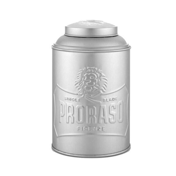 Pojemnik na puder po goleniu marki Proraso.Pojemnik na puder marki proraso jest wykonany z aluminium, na jego boku umieszczono ponadczasowe logo tego włoskiego producenta. Niewielkie otwory pozwalają na łatwą aplikację pudru i wygodne dozowanie produktu wewnątrz.Pojemność 600ml pozwala na umieszczenie w środku nawet 6 opakowań pudru, dlatego nie ma potrzeby częstego uzupełniania pojemnika.