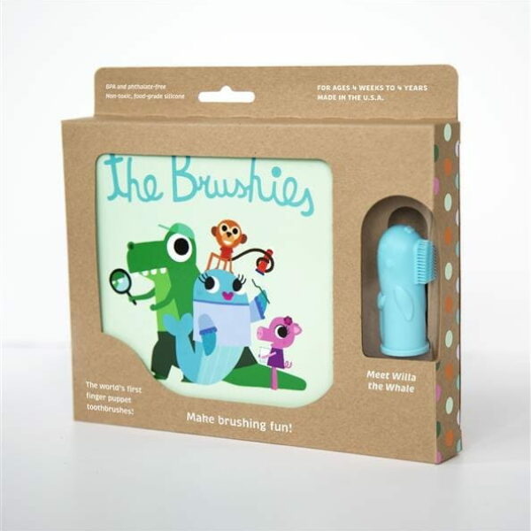 BRUSHIES to świetnie wykonane, certyfikowane, silikonowe szczoteczki - pacynki zakładane na palec. Dzięki nim dzieci zaczynają przygodę z czyszczeniem ząbków bardzo wcześnie i na wesoło. Szczoteczki dodatkowo pielęgnują dziąsła maluszków. Każdy rodzic wie, że dobre nawyki to podstawa. Zalecane są już od 4 tygodnia do 4 roku życia. Szczoteczki są wolne od BPA i ftalatów. Poza tym są nietoksyczne, bezzapachowe i bezsmakowe. Wykonane zostały w 100% ze spożywczego silikonu i zapakowane wyłącznie w opakowania z materiałów pochodzących z recyklingu. Dlaczego polecamy szczoteczki Brushies? Dlatego, że z Brushies mycie ząbków to nie tylko codzienny rytuał higieniczny, ale także mnóstwo radości, zabawy i śmiechu. Są łatwe w czyszczeniu i sterylizacji. Można je myć w zmywarce. The Brushies to zdobywcy nagród m.in. Cribsie Awards. Pojawiły się też m.in. w popularnym czasopiśmie Parent’s Magazine oraz w programie telewizyjnym Today Show, Szczoteczek należy używać rano po śniadaniu i wieczorem przed snem przez co najmniej 10 sekund na górze i 10 sekund na dole. Opakowanie zawiera: 1 szczoteczkę + 1 książeczkę w języku angielskim. Całość zapakowana w kartonik i może być praktycznym prezentem dla maluszka.