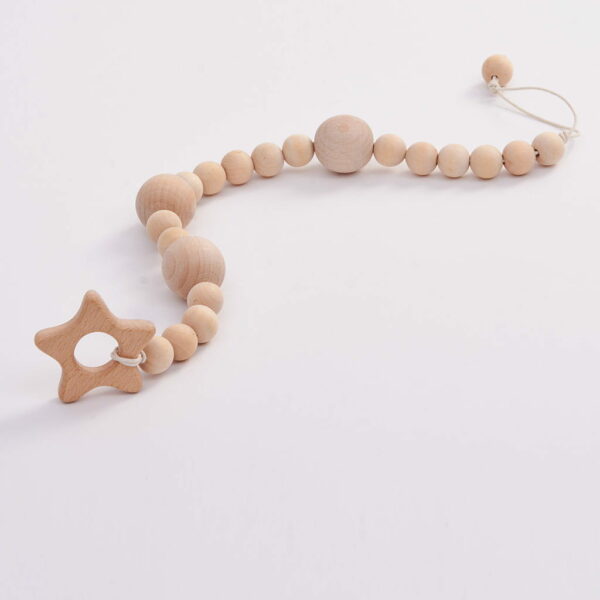 Drewniany gryzak Gwiazdka z zawieszką wykonany został z drewna bukowego. Drewno bukowe to w 100% naturalny, nieimpregnowany materiał. Gryzak drewniany posiada zaokrąglone krawędzie dla bezpieczeństwa maluszka i jego delikatnych dziąsełek. Gwiazdka połączona jest z zawieszką z kulek, która idealnie sprawdzi się jako zabawka dla malutkich rączek. Drewniany gryzak BimBla może pełnić dwie funkcje - gryzaka i zabawki na przykład na spacerze. Zalecenia odnośnie użytkowania drewnianego gryzaka z zawieszką: elementy drewniane najlepiej przecierać wilgotną szmatką lub czyścić szczoteczką nawilżoną wodą, aby zabezpieczyć drewniane elementy zabawkę można zaimpregnować olejem kokosowym. Wymiary gryzaka: około 6 cm x 5 cm. Długość zawieszki: około 40 cm