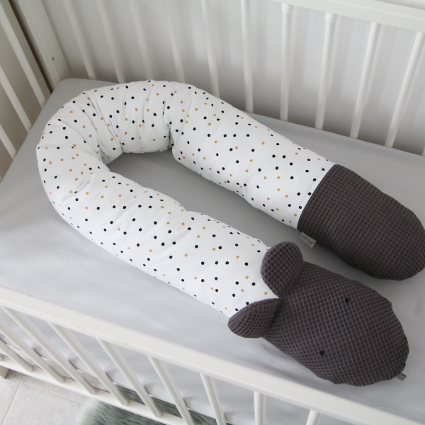 Poduszka 3w1 od Tiny Star to produkt dla mamy i dla maluszka: ułatwia zasypianie i znalezienie komfortowej pozycji dla ciężarnej mamy, szczególnie w ostatnich miesiącach ciąży, gdy kręgosłup i plecy mogą dawać się we znaki przyda się dla maluszka jako poduszka pod brzuszek poduszka 3w1 pełni funkcję ochraniacza do łóżeczka zapobiegającego uderzeniu się w szczebelki kołyski/ łóżeczka (zalecane dla dzieci powyżej 9 miesiąca życia) poduszka podłużny kształt węża- by przyciągała uwagę maluszków ma doszyte także uszy i język oraz namalowane oczka, dzięki czemu wygląda uroczo. Poduszka 3w1 od Tiny Star zapakowana jest w saszetkę zapinaną na suwak. Wymiary: 21 x 180 cm (+/- 2cm). Materiały: wysokiej jakości tkanina 100% bawełniana oraz 100% bawełna o strukturze wafla. Wypełnienie: I gatunku, antyalergiczne, 100% poliester. Pranie: w pralce, 30 stopni, wirowanie max 800 ob/min. Produkt zaprojektowany i uszyty w Polsce.