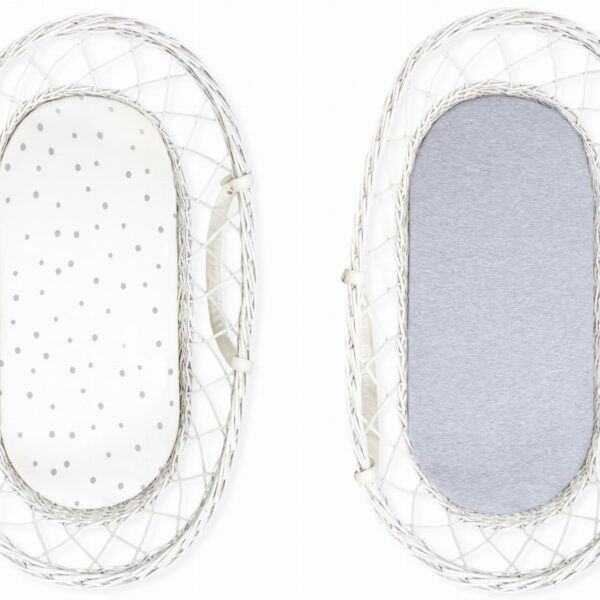 Prześcieradło z gumką do kołyski, gondoli, kosza mojżesza Prześcieradło wykonane zostało z wysokiej jakości, grubej dzianiny bawełnianej. Niezwykle miękkie i rozciągliwe przez zawartość 8% elastanu. Prześcieradło dzięki wszytej gumce można dopasować do każdej kołyski, gondoli, kosza mojżesza, a także przenośnego łóżeczka. Gumka dodatkowo zapobiega jego przesuwaniu. Przyjemny w dotyku materiał, z którego są wykonane jest odpowiedni dla wrażliwej skóry dziecka. Dzianina posiada certyfikat OKO-TEX Standard 100. Skład: 92% bawełna 8% elastan Liczba sztuk w opakowaniu: 2 – w szare kropki i szare Produkt został zapakowany w pudełeczko z okienkiem i może być idealnym pomysłem na prezent.