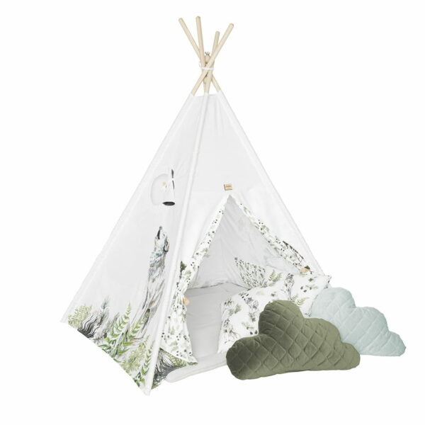 Duży namiot Tipi Wolf Baby Steps Duży namiot Tipi to gwarancja wielogodzinnych zabaw dzieci. Jeżeli szukałeś produktu, który zajmie dzieci? Właśnie go znalazłeś. Wykorzystaj dziecięcą wyobraźnię i zachęć malucha do zabawy w namiocie Tipi. Pozwól by uruchomiło lawinę pomysłów. Może sam przypomnisz sobie zabawy w Indian? Główną zaletą namiotów Tipi Baby Steps jest kompletność. Sam możesz zdecydować czy chcesz dobrać 4 poduszki do kompletu. Jakie zalety inne ma duży namiot Tipi wzór Wolf od Baby Steps? duże wymiary pozwalają na zabawę starszych dzieci i zabawę w kilkoro maluszków. Namiot posłuży latami. Odpowiednia użytkowany także kolejnym dzieciom, wzór Wolf / Wilk inspiruje do zabawy, pojemne 2 kieszenie wewnątrz to idealna skrytka na zabawki czy przekąski, do produkcji wykorzystano najwyższej jakości naturalne materiały: bawełnę z cyfrowym nadrukiem, solidne elementy, które sprawiają, że to produkt premium: okrągłe okienka, sosnowe kije, drewniane guziczki, precyzyjne uszycie, stabilizator kijów. Świetna zabawa i rozwój społeczny to właśnie duże namioty Tipi Baby Steps. Gdy dziecko zaprasza do swojej kryjówki bliskie osoby to przede wszystkim stwarza okazję do nawiązywania relacji i pogłębiania więzi. Rodzice zostają wpuszczeni do dziecięcego świata, przebywają blisko dziecka, co także wzbudza poczucie bezpieczeństwa. Do takiej bazy można zaprosić także inne dzieci, które właśnie nas odwiedziły - taka relacja wspiera rozwój społeczny dziecka. Wszystkie wspólne zabawy uczą dzieci współfunkcjonowania w społeczeństwie, a tego mały człowiek uczy się od najmłodszych lat. Podczas zabawy nabiera się zdolności współpracy i współdziałania co jest fundamentalne i bardzo ważne w dalszym rozwoju. Specyfikacja dużego namiotu Tipi Baby Steps Wolf: wysokość namiotu po rozłożeniu: +/- 160 cm podstawa: +/- 110 cm produkt dla dzieci w wieku powyżej 12 miesięcy w skład zestawu wchodzą: kije do samodzielnego złożenia, bawełniany namiot, stabilizator kijów, sznurek, mata. Poduszki można wybrać dodatkowo Produkt do samodzielnego złożenia. Zalecamy zabawę pod opieką osób dorosłych.