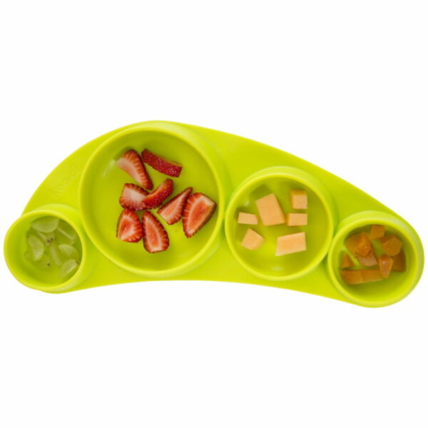Koo-di talerz silikonowy w zielonym kolorze Talerz został zaprojektowany przez Koo-di z myślą o wspomaganiu samodzielnej nauki jedzenia. Ma cztery przegródki oraz antypoślizgowy spód, który dobrze trzyma się podłoża i nie pozwala na przesuwanie czy zrzucanie talerza Koo-di. Koo-di to talerz, który ma też inne zalety: wyższy tył oraz płytszy przód pomogą Maluszkowi samodzielnie jeść. świetnie sprawdzi się przy stosowaniu metody Baby-Led Weaning przy wprowadzaniu do diety stałych pokarmów. kolor jasno szary będzie pasował do większości krzesełek do karmienia. wykonany z nietoksycznego silikonu spożywczego przeznaczona dla dzieci od 6 miesiąca życia można używać w mikrofalówce można myć w zmywarce można używać w piekarniku można mrozić nie zawiera BPA, PVC, ołowiu czy ftalanów jest hipoalergiczny i antybakteryjny Wymiary talerza Koo-di: 34 cm x 13,5 cm x 4 cm. Ile miejsca na stoliku dziecka zajmuje zielony talerzyk Koo-di? Talerzyk Koo-di zajmuje powierzchnię prostokąta o wymiarach 35 cm x 15 cm