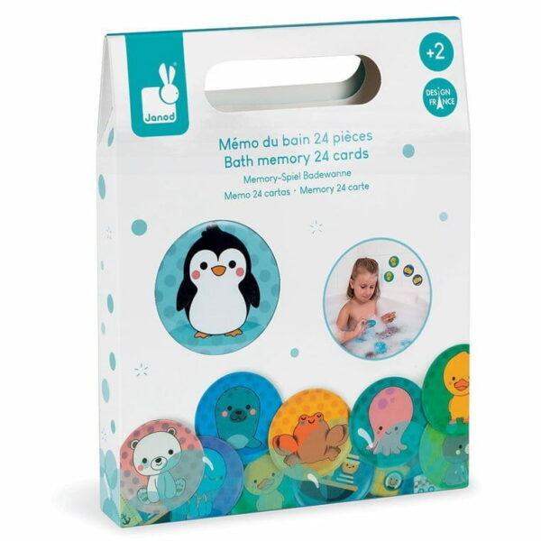 Gra Memory do kąpieli Zwierzątka od Janod składa się z 24 okrągłych wodoodpornych żetonów z 12 różnymi obrazkami Obrazki należy odkryć i zapamiętując ich położenie połączyć w pary. Na żetonach są m.in.: łódź podwodna, foka czy kaczorek. Dziecko może bawić się do woli, nawet w kąpieli. Gra zabawka do kąpieli Zwierzątka rozbudza strategiczne myślenie i planowanie. Rozwija także pamięć i koncentrację. Specyfikacja zabawki do kąpieli Memory Janod: Wiek: od 2 lat Liczba elementów: 24 Materiał: plastik Design: Zaprojektowano we Francji Wymiary produktu: żeton 6,5 x 6,5 x 0,2 Certyfikaty: EN71-1; EN71-2, EN71-3
