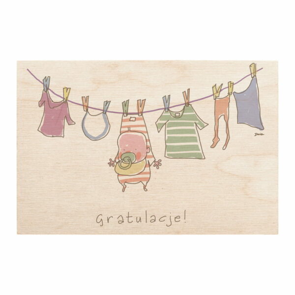 Drewniana kartka z okazji narodzin dziecka Bobas w ubrankach / Miwoodo