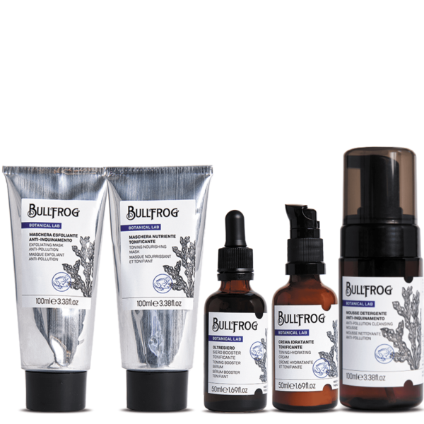 Serum do twarzy dla mężczyzn z linii Blue Botanical marki Bullfrog.To intensywnie nawilżający kompleks składników wzmocniony działaniem kwasu hialuronowego, pozostawia skórę miękką i nawilżoną. Konsystencja serum jest lekka i bardzo szybko się wchłania w skórę. Dzięki ekstraktowi z nadmorskiej sosny daje uczucie długotrwałej świeżości skóry.Najważniejsze składniki serum:Ekstrakt z alg - unikalny blend alg morskich, które odpowiednio połączone nawilżają i wzmacniają strukturę skóry chroniąc przed nieprzyjemnymi skutkami suchej cery.Azuleny - składniki pochodzenia roślinnego, które w tym wypadku są ekstraktem z rumianku o naturalnym kolorze niebieskim.Sosna nadmorska - a właściwie to ekstrakt z kory sosny rozpuszczony w diglicerynie. Zawiera substancje stymulujący witalność komórek wydłużając ich żywotność. Znana jest z kojącego wpływu na skórę poprawiając jej wigor i siłę. Amid niacyny - silny antyoksydant bogaty w witaminę B3, chroni skórę przed promieniami UV i jest idealny dla osób z cerą podatną na zaczerwieniania czy nieczystości.Zapach: Połączenie drzewa cedrowego, skóry i cytrusów.Pojemność: 50 mlSposób użycia: Po oczyszczeniu twarzy, niewielką ilość serum wmasuj w skórę twarzy aż do wchłonięcia.Skład: AQUA (WATER), GLYCERIN, KAPPAPHYCUS ALVAREZII EXTRACT, SODIUM HYALURONATE, NIACINAMIDE, POLYSORBATE 20, HYALURONIC ACID, DIGLYCERIN, MARIS AQUA (SEA WATER), PARFUM (FRAGRANCE), PEG-40 HYDROGENATED CASTOR OIL, GUAIAZULENE, PINUS PINASTER BARK EXTRACT, BENZOTRIAZOLYL DODECYL p-CRESOL, DISODIUM EDTA, PHENOXYETHANOL, ETHYLHEXYLGLYCERIN, SODIUM BENZOATE, POTASSIUM SORBATE.Tonizująca maska do twarzy dla mężczyzn z linii Blue Botanical marki Bullfrog.Głęboko odprężająca skórę maska chroni i nawilża twarz, sprawdzi się nawet w wyjątkowo suchej cerze gwarantując natychmiastowe nawilżenie i wzmocnienie skóry. Tonizująca maska pobudza skórę i zmniejsza jej przesuszenie głęboko nawilżając. W składzie maski znalazły się składniki, które pozwalają utrzymać nawilżenie cery pozostawiając ją świeżą i przyjemną w dotyku. Konsystencja maski przypomina połączenie żelu i olejku, który w kontakcie ze skórą przypomina emulsję i jednocześnie ułatwia zmywanie maski ponieważ w połączeniu z wodą zamienia się w delikatną wodę przypominającą mleko.Najważniejsze składniki maski:Ekstrakt z alg - unikalny blend alg morskich, które odpowiednio połączone nawilżają i wzmacniają strukturę skóry chroniąc przed nieprzyjemnymi skutkami suchej cery.Azuleny - składniki pochodzenia roślinnego, które w tym wypadku są ekstraktem z rumianku o naturalnym kolorze niebieskim.Sosna nadmorska - a właściwie to ekstrakt z kory sosny rozpuszczony w diglicerynie. Zawiera substancje stymulujący witalność komórek wydłużając ich żywotność. Znana jest z kojącego wpływu na skórę poprawiając jej wigor i siłę. Ekstrakt z czerwonych alg - przywraca skórze barierę, która chroni przed utratą wody.Zapach: Słony zapach inspirowany morskimi składnikami maski.Pojemność: 100 mlSposób użycia: Po oczyszczeniu twarzy, niewielką ilość produktu nanieś na suchą skórę twarzy. Rozprowadź po skórze unikając okolic oczu. Pozwól masce działać przez 15 minut i zmyj z twarzy ciepłą wodą. Stosuj raz w tygodniu.Skład: OCTYLDODECANOL, CAPRYLIC/CAPRIC TRIGLYCERIDE, GLYCERIN, POLYGLYCERYL-10 MYRISTATE, AQUA (WATER), CETEARYL ALCOHOL, PARFUM (FRAGRANCE), KAPPAPHYCUS ALVAREZII EXTRACT, DIGLYCERIN, MARIS AQUA (SEA WATER), POLYSORBATE 20, PEG-40 HYDROGENATED CASTOR OIL, GUAIAZULENE, PINUS PINASTER BARK EXTRACT, PENTAERYTHRITYL TETRA-DI-t-BUTYL HYDROXYHYDROCINNAMATE, BENZOTRIAZOLYL DODECYL p-CRESOL, DISODIUM EDTA, PHENOXYETHANOL, ETHYLHEXYLGLYCERIN, SODIUM BENZOATE, POTASSIUM SORBATE, LIMONENE.Złuszczająca maska do twarzy dla mężczyzn z linii Blue Botanical marki Bullfrog.Złuszczająca maska usuwa barierę na skórze jaką jest martwy naskórek blokujący pory, otwiera je ułatwiając kosmetykom głębsze, skuteczniejsze i dokładniejsze nawilżenie. Maska Bullfrog usuwa barierę jaką jest martwy naskórek a dzięki odpowiedniej recepturze chroni przed szkodliwym działaniem czynników środowiskowych.Najważniejsze składniki maski:Ekstrakt z alg - unikalny blend alg morskich, które odpowiednio połączone nawilżają i wzmacniają strukturę skóry chroniąc przed nieprzyjemnymi skutkami suchej ceryAzuleny - składniki pochodzenia roślinnego, które w tym wypadku są ekstraktem z rumianku o naturalnym kolorze niebieskimSosna nadmorska - a właściwie to ekstrakt z kory sosny rozpuszczony w diglicerynie. Zawiera substancje stymulujący witalność komórek wydłużając ich żywotność. Znana jest z kojącego wpływu na skórę poprawiając jej wigor i siłę.Pył z węgla aktywnego - usuwa zanieczyszczenia i tłuste ślady ze skóry, reguluje produkcję sebum zmniejszając ilość nieczystości i zaskórnikówZapach: Drzewo cedrowe, skóra i cytrusyPojemność: 100 mlSposób użycia: Po oczyszczeniu twarzy, niewielką ilość produktu nanieś na wilgotną skórę twarzy. Rozprowadź po skórze unikając okolic oczu. Pozwól masce działać przez 10-15 minut i zmyj z tw