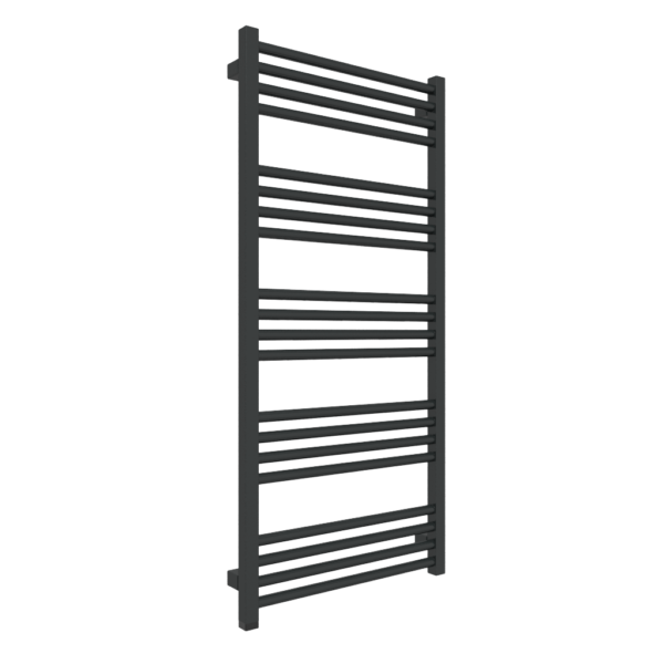 FIONA ONE 1140/530 RAL 9005 mat E8; przyłącze E8; Grzejnik łazienkowy wyróżniający się prostotą uzyskaną dzięki rytmicznie powtórzonym sekcjom profili. Odstępny między sekcjami pozwalają na łatwe zawieszenie ręczników do wysuszenia. Ukryta w kolektorze grzałka One nie zmienia percepcji bryły, a jednocześnie pozwala użytkować urządzenie poza sezonem grzewczym. Timer daje możliwość automatycznego wyłączenia grzałki po dwóch godzinach. Grzałka One jest bardzo ekonomiczna, pobór prądu w stanie czuwania wynosi 0,5W.