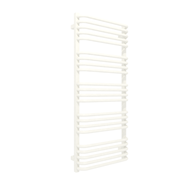 ALEX 1140/500 RAL 9016 SX; przyłącze SX; Klasyczny grzejnik łazienkowy zbudowany z kolektorów o przekroju prostokąta połączonych za pomocą wygiętych rurek. Rurki typu "C" oraz zachowanie przestrzeni między sekcjami ułatwiają zawieszenie ręczników, dzięki czemu Alex dobrze sprawadza się zarówno w roli ogrzewacza pomieszczeń jak i suszarki.