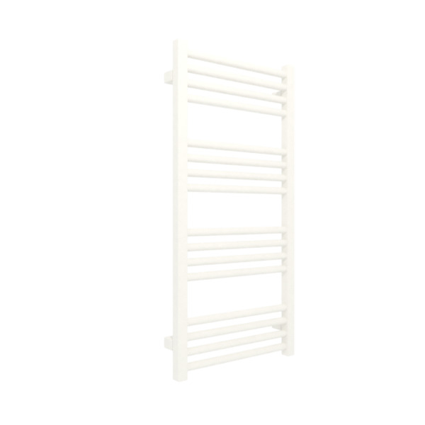 FIONA 900/430 RAL 9016 SX; przyłącze SX; Grzejnik łazienkowy wyróżniający się prostotą uzyskaną dzięki rytmicznie powtórzonym sekcjom profili. Odstępny między sekcjami pozwalają na łatwe zawieszenie ręczników do wysuszenia. Do grzejnika pasuje wieszak Yo!