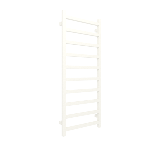 SIMPLE 1200/500 RAL 9016 SX; przyłącze SX; Tym co odróżnia grzejnik Simple od klasycznych łazienkowych drabinek, są bezszwowe łączenia oraz specjalnie zaprojektowane wieszaki, które pozwalają na zabawę formą i kolorystyką. W ofercie dostępne są także drewniane półki zwiększające funkcjonalność modelu.