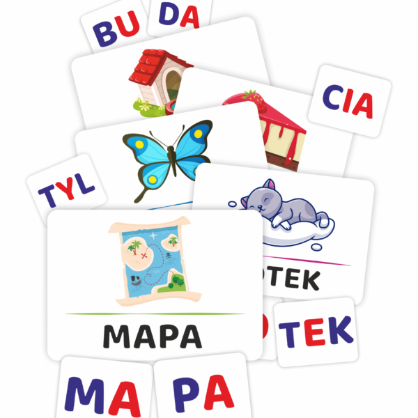Głównym zadaniem dziecka jest czytanie, poznawanie oraz układanie wyrazów oraz sylab na kartach.Literki podzielono kolorystycznie na spółgłoski oraz samogłoski.Karty rozwijają umiejętności czytania.Wszystkie wyrazy w zestawie są dwusylabowe – idealnie sprawdzą się na pierwsze próby podziału wyrazów na sylaby.Nauka czytania metodą sylabową może sprawić, że dziecko będzie chętniej podchodzić do nauki czytania i szybciej ją przyswoi.Przy okazji w naszej układance ćwiczymy podział słów na sylaby, a także literek na spółgłoski i samogłoski.Wyrazy zapisano dużymi literami w celu przyjemniejszej oraz łatwiejszej nauki.Do kart można wymyślić dziecku zadania lub historyjki - dzięki temu można połączyć naukę z przyjemnością zabawy.Przyjazne dla oka obrazki sprawią, że dziecko wiele chętniej będzie ćwiczyć i rozwijać swoje zdolności.Układanka edukacyjna dla dzieci do nauki sylab i czytaniaZestaw zawiera aż 126 kolorowych kart do nauki sylab:42 karty z nazwami zwierząt oraz rzeczy,a także 84 karty z pasującymi do nich sylabami.Wydrukowane na papierze 200g, a także zalaminowane, dzięki czemu zyskują dodatkową trwałość oraz sztywność. Rogi w kartach są zaokrąglone – dla jeszcze większej trwałości oraz przyjemności używania!Cechy produktu:Format: ~ 10 cm x 7 cm oraz 5 cm x 4 cmKarty obrazkowe o rozmiarze: ~ 10 cm x 7 cm,Karty podzielone na sylaby o rozmiarze: ~ 5 cm x 4 cm126 kolorowych kart.Wydrukowany na sztywnym papierze 200g.Karty zalaminowane.Rogi zaokrąglone dla jeszcze większej trwałości.Żywe, przejrzyste kolory.