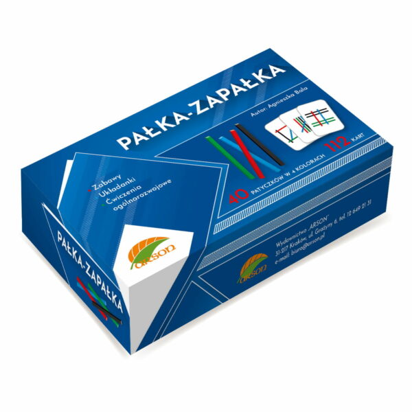 Pałka-zapałka Arson to zestaw kart, którego podstawowym celem jest układanie patyczków według wzoru przedstawionego na karcie. Liczba patyczków we wzorze wyznacza gradację trudności zadania.Dodatkowe ćwiczenia, które można zaproponować dziecku:układanie wypranego wzoru z pamięci,przerysowywanie wzoru,rysowanie wzoru z pamięci,układanie wzoru z zapałek,układanie patyczków, według wzoru przedstawionego przez dorosłego,układanie kolejno sekwencji patyczków, według instrukcji słownej.Karty edukacyjne Arson Pałka-ZapałkaDodatkowe zabawy, które można zaproponować rodzinie:Kto pierwszy?Na stół wykładamy jedną kartę. Uczestnicy zabawy układają wzór. Kto pierwszy ułoży wzór wygrywa.Mam patyczek Każdy uczestnik otrzymuje jedną kartę. Odwraca ją tak, by nie widział wzoru. Pozostałe karty należy pozostawić na środku stołu. Gracze przyglądają się karcie pozostawionej na stole i porównują ją ze swoją. Jeżeli któryś z graczy, wskaże jeden kolor patyczka, który jest jednocześnie tym samym patyczkiem na karcie gracza, zabiera kartę. Wygrywa ta osoba, która zbierze najwięcej kart.Przeznaczenie:TerapiaEdukacjaZabawa z rodzinąCele:Analiza i synteza wzrokowaRozwijanie sekwencji słuchowejWydłużanie koncentracji uwagiUsprawnianie grafopercepcjiZawartość:dwie talie kart każda po 56 (112 wzorów) o różnym stopniu trudności40 patyczków w 4 kolorach (zielony, czarny, czerwony, niebieski)instrukcjapudełko tekturowe