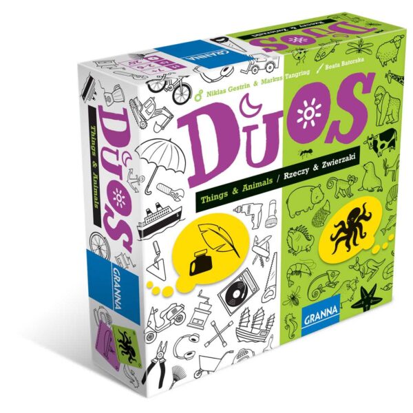 W Duos liczy się kreatywność oraz umiejętność przywidywania skojarzeń pozostałych uczestników rozgrywki. Szybkie rundy i masa ciekawych rozmów nad stołem – to właśnie Duos, towarzyska gra, która sprawdzi się zarówno w gronie rodziny, jak i znajomych. Jednocześnie na rynku zadebiutują dwa pudełka. Każde zawiera 2 kategorie i wszystko co jest potrzebne do zabawy. Zawartość obu można połączyć.Duos. Zasady gryPołącz obrazki w pary, oznaczając to za zasłonkami.Otrzymuj punkty za identyczne pary.Zdobądź najwięcej punktów, by wygrać.DUOS to towarzyska gra o tworzeniu par – prostych i oczywistych. Z 12 kart losowanych w każdej turze musicie wybrać 4 pary, najlepiej takie same jak pary Narratora. Proste, prawda? Zobaczymy, jak Wam pójdzie!Przyjrzyjcie się uważnie kartom na stole i stwórzcie z nich 4 pary, układając za zasłonkami znaczniki na swojej planszetce. Aby stworzyć parę, połóżcie na planszetce 2 znaczniki tego samego koloru na miejscach odpowiadających układowi kart. Obrazki łączcie w pary na zasadzie dowolnych skojarzeń, chociaż najlepiej, żeby decyzje były przemyślane i odpowiadały parom, które stworzył Narrator.Gdy wszyscy będą gotowi, odsłońcie swoje planszetki. Czas porównać Wasze pary z parami Narratora.WAŻNE! W trakcie tworzenia par nie wolno Wam się komunikować, ale wiadomo, różnie bywa – starajcie się zatem nie sugerować innym zbyt wyraźnie, jakich wyborów dokonaliście.Zawartość pudełka:116 dwustronnych kart z ilustracjami sport/baśnie lub zwierzęta/rzeczy6 planszetek gracza6 zasłonek48 drewnianych znaczników50 żetonówInstrukcjaLiczba graczy: od 2 do 6 osóbWiek: od 7 lat