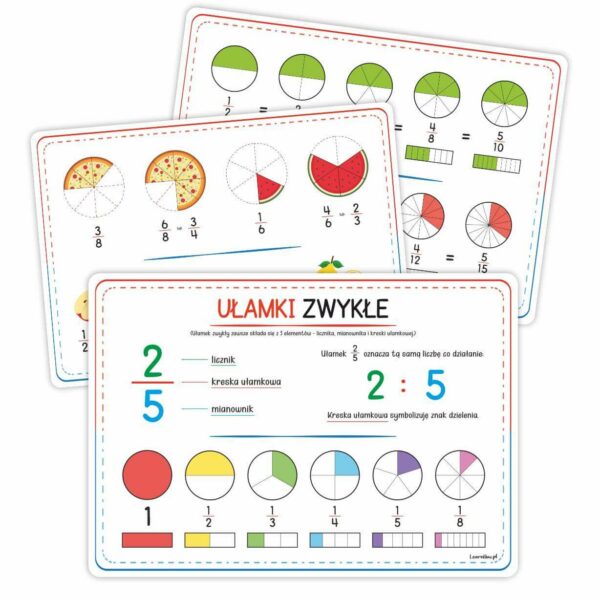 Plansze edukacyjne. Ułamki zwykłe - zestaw matematyczny (3 plansze A4)