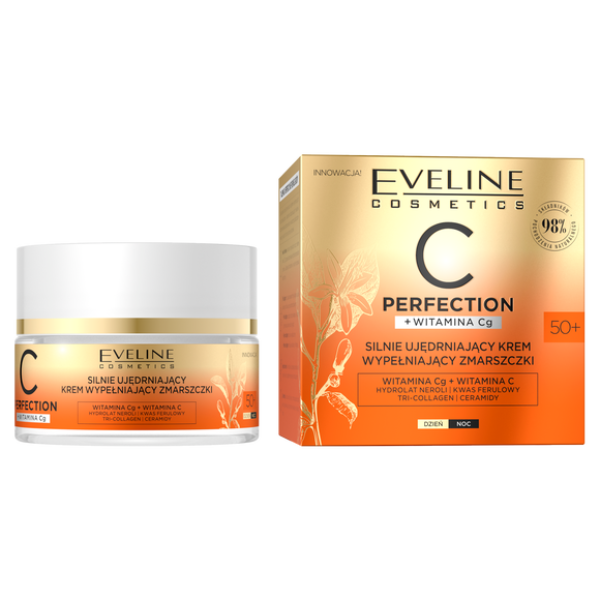 Eveline C-Perfection Silnie Ujędrniający Krem Wypełniający Zmarszczki 50+ 50MLEveline Cosmetics C-Perfection to krem, który głęboko nawilża, uelastycznia, minimalizuje widoczność zmarszczek, a przy tym rozjaśnia przebarwienia. Połączenie witaminy C z kwasem ferulowym energetyzuje, nadaje zdrowy blask, a także pobudza procesy rewitalizacji. Dodatkowo chroni skórę przed szkodliwym działaniem wolnych rodników, niweluje oraz opóźnia starzenie się skóry.Intensywnie nawilża i nawadniaDziała przeciwzmarszczkowoUjednolica koloryt skóryOdżywia i rewitalizujeRegeneruje ceręRozjaśnia i wygładzaDla osób 50+Aż 98% składników pochodzenia naturalnegoStosowanie: Nanieś kosmetyk na oczyszczoną skórę twarzy, szyi i dekoltu. Sprawdzi się również jako baza pod makijaż. Krem można stosować na dzień i na noc.