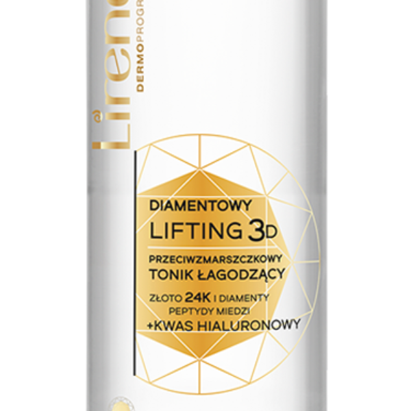 Lirene Diamentowy Lifting 3D Przeciwzmarszczkowy Tonik Łagodzący 200MLFormuła toniku łączy składniki o udowodnionym działaniu odświeżającym, odmładzającym i przywracającym pH skórze. Bogactwo substancji odżywczych zapewnia skórze gładkość i miękkość.Składniki aktywne zawarte w toniku Lirene Diamentowy Lifting 3D:Diamentowy Lifting 3D - jest to linia nowoczesnych produktów przeciwzmarszczkowych opartych na luksusowych składnikach anti-aging które przynoszą spektakularne efekty inspirowane zabiegami prosto z salonów kosmetycznych. Wykorzystuje odmładzającą moc diamentu, 24-karatowego złota i peptydów miedzi. Połączone w jednej formule, składniki aktywne przenikają warstwy skóry i stymulują procesy odnowy. Skóra staje się bardziej jędrna i napięta, a zmarszczki widocznie spłycone.Duet złota i diamentu - wykazuje działanie rewitalizujące i przeciwstarzeniowe. Pył diamentowy poprawia mikrocyrkulację, oczyszcza skórę i opóźnia proces powstawania zmarszczek. Nadaje cerze zdrowy wygląd i ją rozświetla. 24k złoto redukuje zmarszczki i zapobiega ich powstawaniu, poprawia napięcie oraz jędrność skóry, w wyniku stymulacji fibroblastów do produkcji kolagenu i elastyny.Peptydy miedzi - mają klinicznie potwierdzone działanie: poprawiają elastyczność, zagęszczają i pogrubiają skórę, redukują zmarszczki, ujednolicają koloryt. Dodatkowo są bezpiecznedla skór wrażliwych. Przyspieszają odnowę żywej warstwy naskórka, przyspieszając namnażanie się keratynocytów. Stymulują produkcję kolagenu skuteczniej od witaminy C, tretynoiny(kwasu retinowego).Kwas Hialuronowy - wiąże wodę w skórze, silnie ją nawilżając i wygładzając, tworzy na skórze film zabezpieczający przed wpływem niekorzystnych czynników zewnętrznych.Alantoina i d-panthenol - nawilżają i łagodzą podrażnienia.Betaina - wzmacnia hydrolipidową barierę skórną.Sposób użycia toniku Lirene:Nanieś tonik na wacik kosmetyczny.Delikatnie przetrzyj skórę twarzy, szyi i dekoltu.Stosuj codziennie rano i wieczorem.