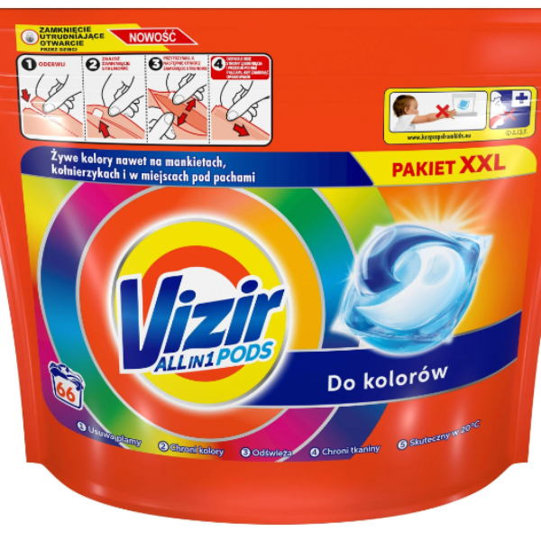 Vizir All in 1 Color Kapsułki Do Prania Tkanin Kolorowych 66 SztukKapsułki do prania Vizir ALL in 1 Color to niesamowita moc piorąca zamknięta w jednej kapsułce. Wypróbuj teraz kapsułki do prania Vizir ALL in 1, które dzięki zawartej w nich mocy piorącej poradzą sobie z zabrudzeniami nawet w trudnych do wyczyszczenia miejscach (mankiety, kołnierzyki i materiał w okolicy pach), zachowując żywe kolory tkanin oraz zapewniając dokładne, higieniczne pranie.Podzielone są na trzy komory, dzięki czemu poszczególne składniki są od siebie odseparowane, dopóki innowacyjna osłonka nie rozpuści się w wodzie, uwalniając najwyższą moc kapsułki All in 1: Usuwają zabrudzenia, chronią kolory i tkaniny, zapewniają świeży zapach i skutecznie piorą nawet w temperaturze 20°C Wystarczy jedna kapsułka, aby dokładnie wyprać pełny wsad pralki. Kapsułki Vizir ALL in 1 to gwarancja higienicznego prania. Używaj razem z płynami do zmiękczania tkanin Lenor, by uzyskać dodatkową miękkość i świeżość.usuwają zabrudzenia, zachowując żywe kolory ubrańzapewniają dokładne, higieniczne praniechronią tkaniny i nadają świeży zapach