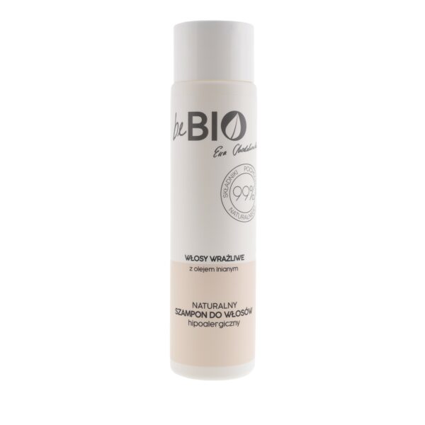 beBIO Naturalny hipoalergiczny szampon do włosów wrażliwych 300ml:Szampon do włosów wrażliwych, zawiera 99,4% składników pochodzenia naturalnego.Idealny do częstego stosowania do włosów wrażliwych. Specjalnie dobrane składniki pochodzenia naturalnego ułatwiają rozczesywanie włosów na mokro i sucho oraz dodają im objętości i gładkości.Szampon zawiera nawilżający sok z liści aloesu oraz bogaty w nienasycone kwasy tłuszczowe omega 3 i 6, olej lniany, który wspomaga wygładzenie i połysk włosów, dodając miękkości.Z kolei nawilżacz cukrowy to składnik długotrwale i silnie nawilżający.Tocopherol, czyli witamina E to doskonały przeciwutleniacz, zwany witaminą młodości.Szampon wzbogacony jest także minerałami z soli morskiej, które wspomagają i przywracają prawidłowe funkcjonowanie skóry głowy i włosów.Naturalny hipoalergiczny szampon do włosów wrażliwych nie zawiera kompozycji zapachowej.Sposób użycia: Nanieś niewielką ilość szamponu na mokre włosy, delikatnie wmasuj, a następnie spłucz. Jeśli Twoje włosy tego potrzebują, powtórz czynność.