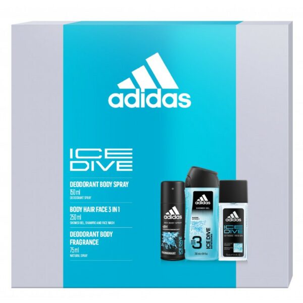 Adidas Ice Dive Zestaw Dezodorant Atomizer 75ML + Żel Pod Prysznic 250ML + Antyperspirant Spray 150ML Męski zestaw prezentowy od Adidas w skład którego wchodzą topowe produkty z serii Ice Dive. W skład tego kozackiego zestawu wchodzą następujące kosmetyki:Adidas Ice Dive Dezodorant W Atomizerze 75ML - Doznania sportowe mają wiele twarzy – tak jak i Ty. Od etapu rosnącej ekscytacji po poczucie osobistego zwycięstwa, adidas zawsze towarzyszył Ci jako kompan w tej podróży. Adidas Ice Dive to chłodny, orzeźwiający zapach dla aktywnych mężczyzn, poszukujących intensywnych przeżyć.Adidas Ice Dive Antyperspirant spray 150ML - Adidas prezentuje linię męskich dezodorantów w sprayu. Adidas opracował ją z udziałem sportowców. Ciekawe, orzeźwiające zapachy i wygodne opakowanie sprawią, że często będziesz wracał do tych produktów. Poznaj niezwykle męski, ozonowy zapach Adidas Ice Dive.Adidas Ice Dive Żel Pod Prysznic 250ML - Nowa edycja żeli pod prysznic ADIDAS różni się od innych żeli swoim przyjemnym, energetyzującym zapachem. Składa się on zarówno z nut owocowych jak i kwiatowych. Pobudza do działania i dodaje pewności siebie. Kosmetyk świetnie sprawdza się jako żel do ciała oraz szampon do włosów. Idealne zarówno do odświeżenia po ciężkim dniu w pracy jak i intensywnym wysiłku fizycznym.Nuty zapachowe:Nuta głowy: kiwi, lawenda, mandarynka, yuzu, mięta, grejpfrut, anyż, bergamotkaNuta serca: drzewo sandałowe, paczula, geraniumNuta podstawowa: bób tonka, wanilia, pieprz, ambra